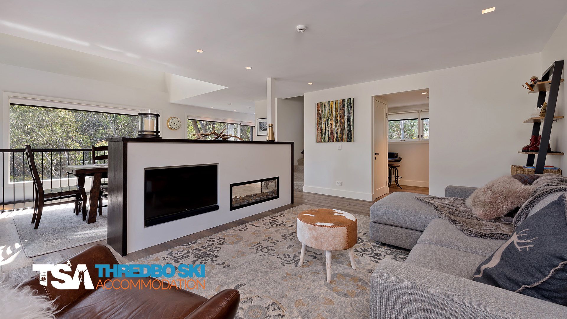 Enjoy the seamless flow between the dining and lounge areas, cleverly separated by a built-in Escea gas fireplace. This design enhances both functionality and aesthetic appeal, creating an inviting space for relaxation and entertainment. The chalet's ambiance is characterized by its modernity, brightness, and a welcoming atmosphere that comes from the abundant natural light streaming in through the generously sized windows.